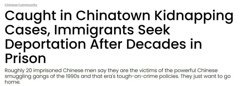 据报道,纽约州一些在押华裔男子自述,在 90 年代,他们被唐人街偷渡团伙胁迫参与犯罪。其中一些人坚定地声称自己无辜,当年语言和文化的巨大隔阂,叠加严苛的打击犯罪政策,使他们"蒙冤入狱"。