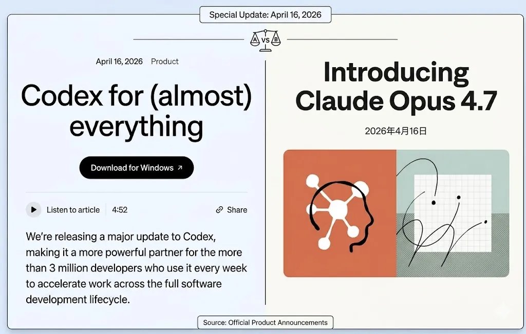 Anthropic新推Claude Opus 4.7,基准数据漂亮,社区口碑却翻车,沃顿教授直指其对非代码任务"降级偷懒"。同一天,OpenAI将Codex升级为可操作整台电脑、跨应用的超级工作台,将AI竞争推升至系统能力层。
