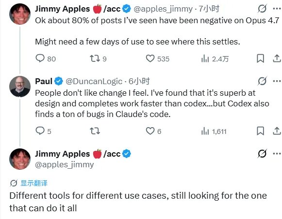 用户 @Stardustmemory 说得更重,Opus 4.7 在本该简洁的地方凭空制造复杂性,导致他甚至不想续订,因为 Codex 往往能更高效地重写 Opus 做的计划。