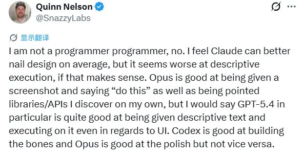 在真实的编程环节,用户@SnazzyLabs总结出了一个精准的差异:Claude的Opus擅长“打磨”和抓住设计精髓,但在根据描述性文本执行具体任务时,GPT-5.4支持的Codex则表现得更出色 。