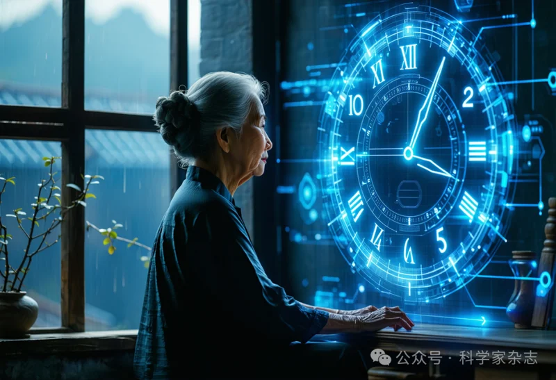 新研究显示,害怕与年龄相关的健康衰退的女性,可能在细胞层面衰老更快。对健康的担忧越强,生物学“时钟”走得似乎越快。图片来源:科学家杂志AI绘图