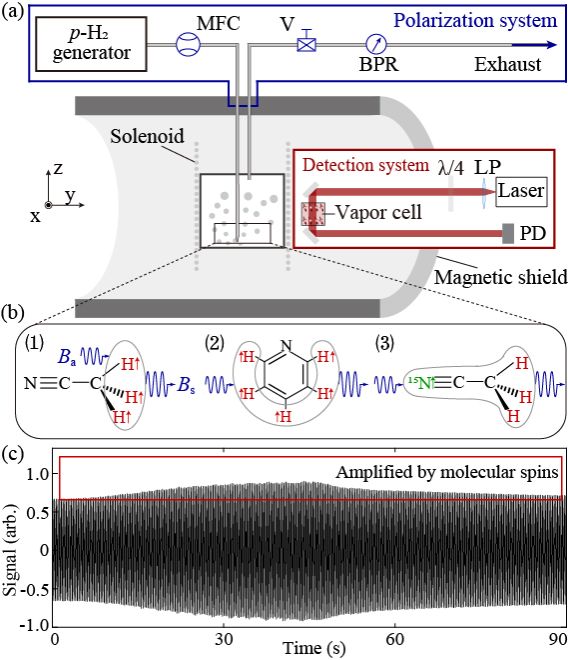 中国科学技术大学自旋磁共振实验室彭新华教授、江敏教授及其合作者,系统发展了分子核自旋的超极化技术,并提出将其用于量子传感的新方法,首次实现了基于超极化分子核自旋的磁场信号放大,将核自旋对微弱磁场的响应能力至少提升了四个数量级。相关研究成果以"Hyperpolarized Molecular Nuclear Spins Achieve Magnetic Amplification"为题于2026年4月2日在线发表于《物理评论快报》(Physical Review Letters)。