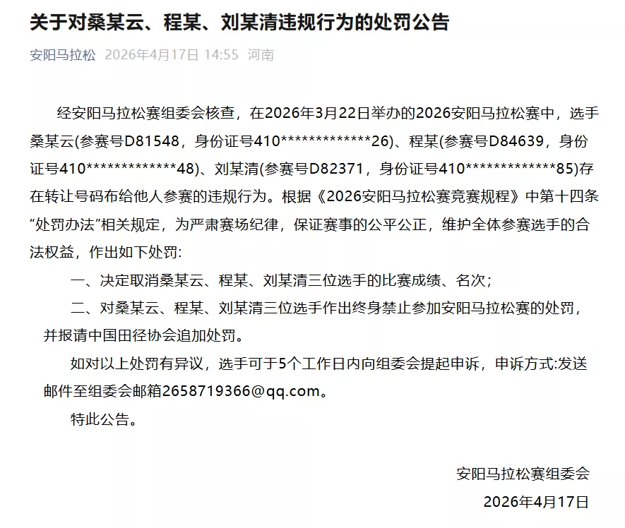 经安阳马拉松赛组委会核查,在2026年3月22日举办的2026安阳马拉松赛中,选手桑某云(参赛号D81548,身份证号410*************26)、程某(参赛号D84639,身份证号410*************48)、刘某清(参赛号D82371,身份证号410*************85)存在转让号码布给他人参赛的违规行为。