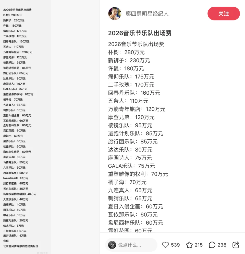 譬如,这份发布在小红书的《2026音乐节乐队出场费》,当编辑部拿着这份名单向业内人士求证时,发现其中有些乐队的实际报价比这份报价单上的还要更高。也有乐队报价仅只有这张表格报价中的一半:“反正我们乐队的价格加得太夸张了”,亦有乐队经纪人表示:“这个价格是二道贩子加过价的,基本没一个准的”。