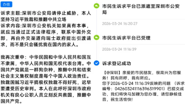 据X推主“芙宁娜娜Furinana(王者归来版)”4月17日上传的两张截图内容显示,该案诉求编号是:042603241116973619901,诉求主题是“深圳市公安局请停止威胁,本人坚持习近平独裁和推翻中共立场”。诉求内容如下: