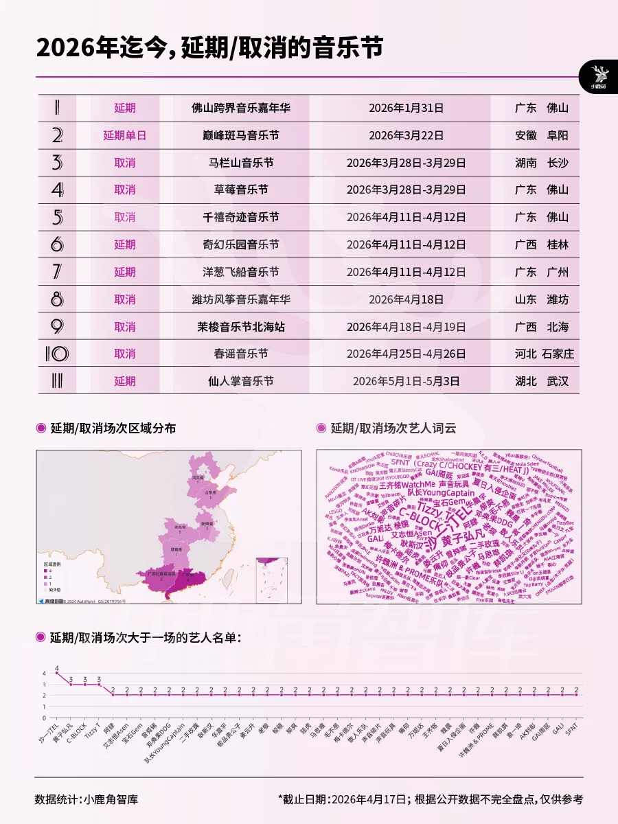 从地区分布看,今年的11场延期取消音乐节中,有8场都发生在两湖两广地区,广东4场。这一总数,较一个月前音乐财经的统计又增加了8场。就在发稿前,春谣音乐节也发布了演出取消举办的公告。(回顾:接连取消延期,3月仅剩6场|2026年Q1音乐节市场观察)