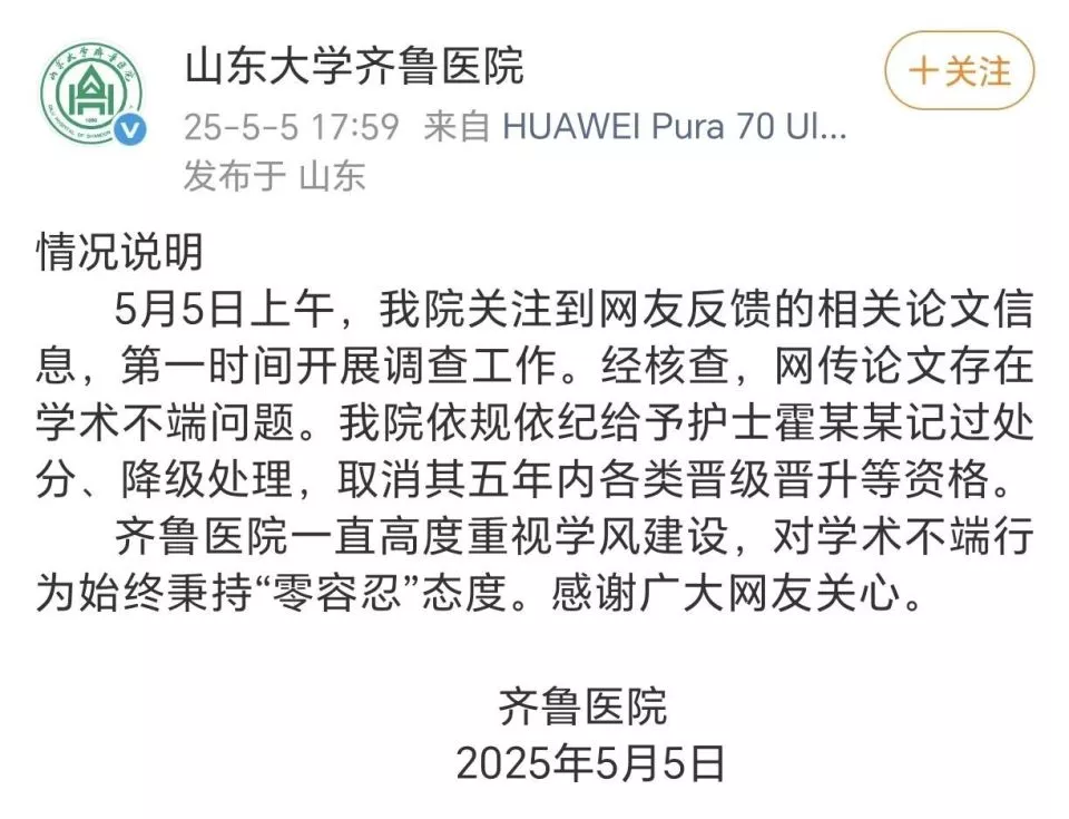 〓关于子宫肌瘤围手术期护理的论文争议,其作者所在单位发布情况说明
