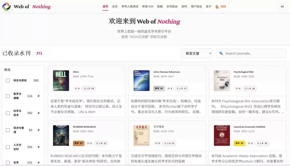 远在意大利读博的黄家轩,则利用搭建生物信息数据库的思路,做出了一个名为WoN(Web of Nothing)的检索网站,收录各类底刊,如今已有近400本,涵盖医学、科技、经管、人文社科甚至玄学等类别。