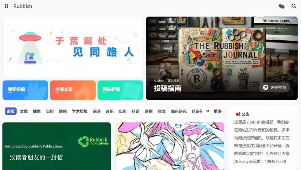 2月12日晚,硕士生陈扬将自己的社媒账号改为《Rubbish》,成为互联网最早成立的底刊之一。第二天,他便收到了十几份投稿。与此同时,网友纷纷自荐加入编辑部、创建子刊或成为审稿人,还有人临时注册网站发布稿件。