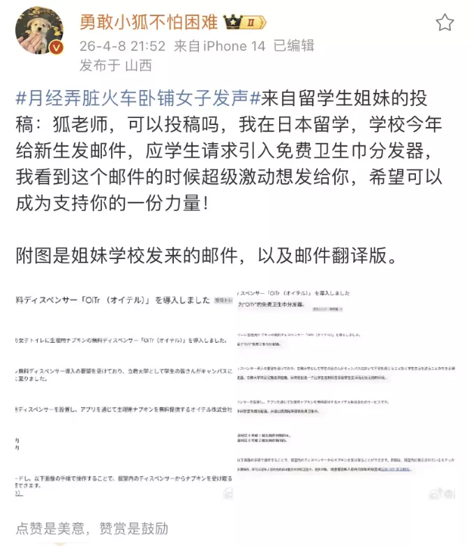 “我代理这个案子的初衷,并非仅仅因为180元的床单赔偿。”赵一婕说,“小狐的遭遇,本质是女性生理刚需在公共服务中被忽视、个体在面对公共机构时的举证弱势被放大。我希望通过这个案件,推动公共服务对女性权益的重视。”