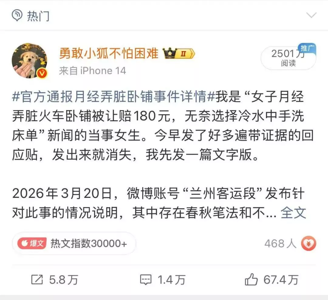 2026年3月,一桩因火车卧铺上一滩经血引发的争议,从微博热搜到法律诉讼,当事人“小狐”(化名)与“兰铁”的拉锯,成为一场关于女性权利、公共服务、以及个人对抗系统的微型抗争。
