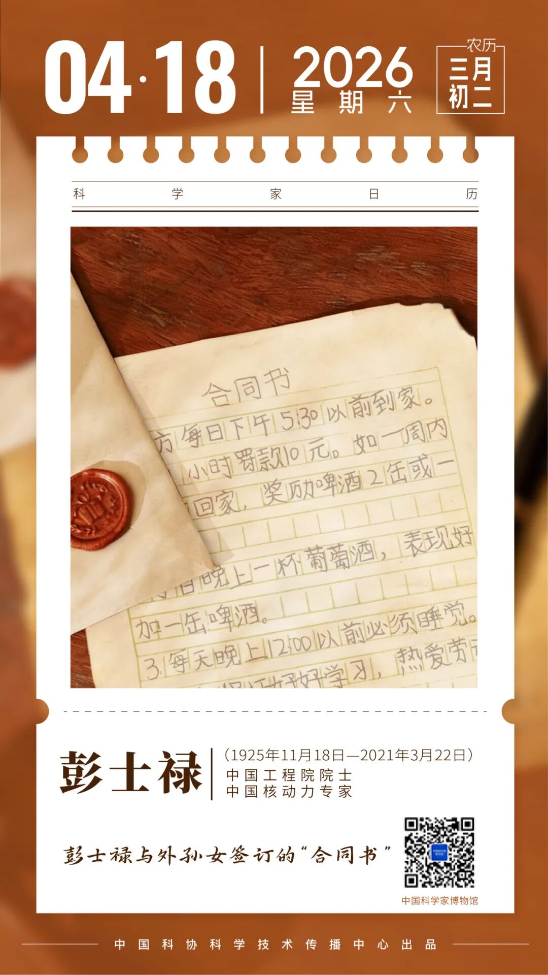 在中国科学家博物馆藏品里,有这样一份特殊的“合同书”,甲方是“老朋友:彭士禄”,乙方是“小朋友:彭瑶”。