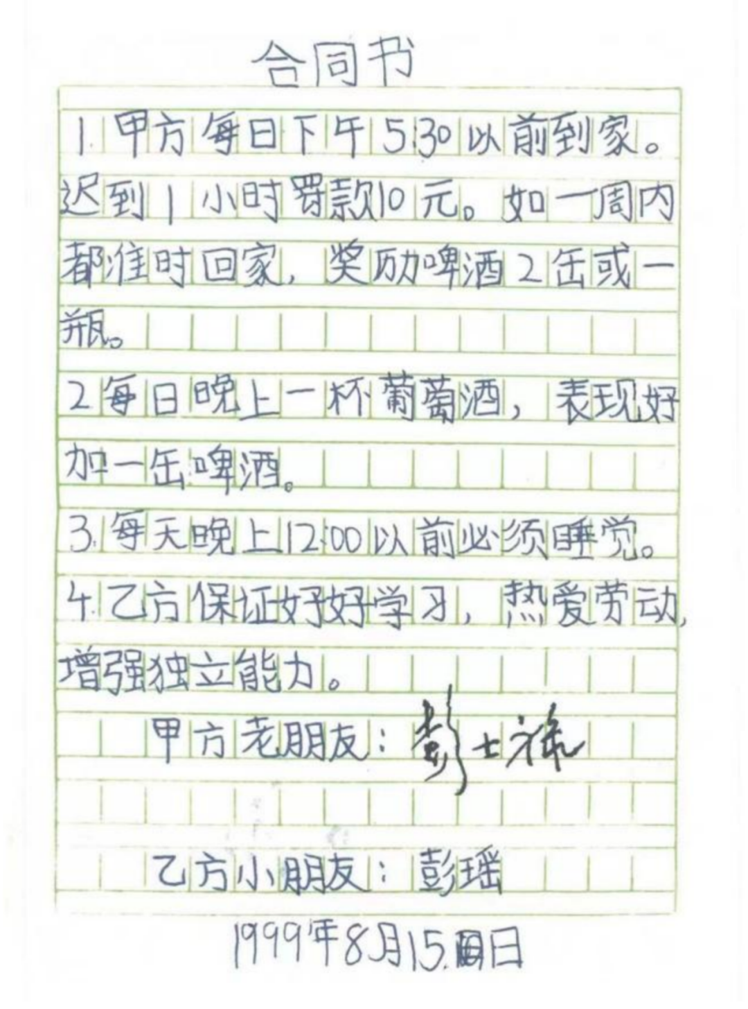今天,让我们重温1999年8月15日,“老朋友”彭士禄和“小朋友”彭瑶签订的“合同书”,一起见证祖孙情深。