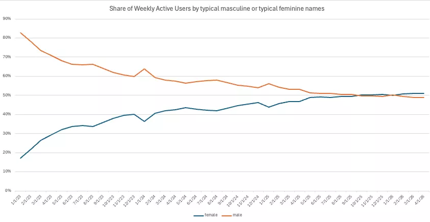 IT之家 4 月 17 日消息,OpenAI 最新公布数据显示,其 ChatGPT 用户群体结构发生历史性转变。ChatGPT 应用在 2022 年发布时,男性用户比例约为 80%,女性用户比例约为 20%;而目前女性用户已超过男性,占比超过 50%。