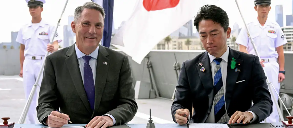 澳大利亚国防部长马尔斯与日本防卫大臣小泉进次郎在墨尔本签署合同。图像来源: William West/AFP