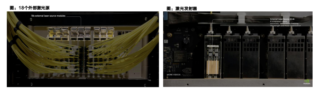 天风证券报告介绍,英伟达Quantum-X Photonics配备18个外部激光源(ELS),每个ELS模块包含8个独立激光发射器,整机共144个。每个激光器支持4×200Gbps通道,单MPO连接器总带宽800Gbps。