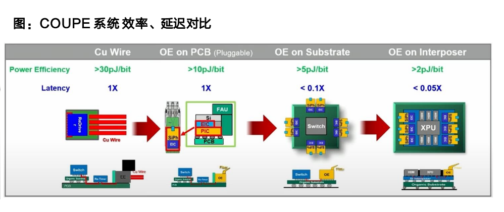 从系统能效角度,传统铜互连系统功耗通常超过30 pJ/bit,传统可插拔光模块亦在10 pJ/bit以上;而基于COUPE完全集成的光学引擎,单位能耗可降至2 pJ/bit以下,同时延迟降低超过95%。