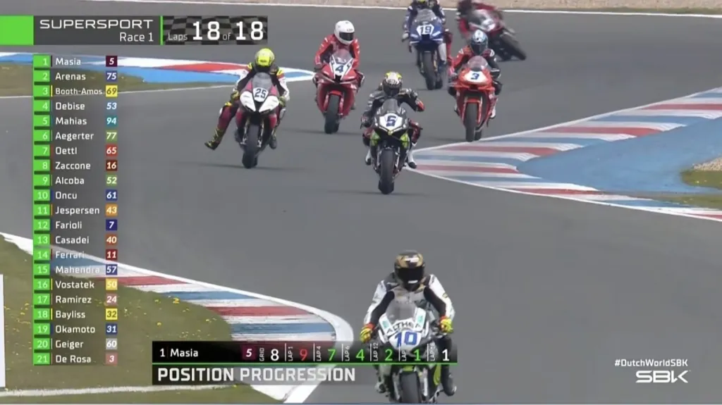 进入正赛后,德比斯长时间处于第一集团。比赛进行到倒数第八圈时,他从第一的位置滑落至第五。倒数第五圈,前排多位车手发生碰撞,德比斯趁机升至第二位。在随后的激烈缠斗中,德比斯一度实现反超并领跑全场。然而在最后一圈的出弯阶段,他出现失误,名次回落至第三;冲刺阶段又因另一次失误遭到罚时,最终以第四名的成绩冲线。 值得一提的是,在荷兰站的比赛中,“张雪机车”换上了全新涂装,美的、大疆、荣耀等中国品牌也纷纷以赞助商身份亮相。