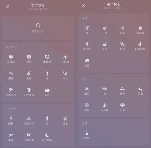 2021年,微信推出了“状态”功能,提供“美滋滋”“裂开”“摸鱼”“搬砖”等数十个预设状态标签,用户可以随时更新当下的心情或活动,有效期只有24小时。微信创始人张小龙表示,希望“状态”成为朋友圈的反面,让人不必再装。