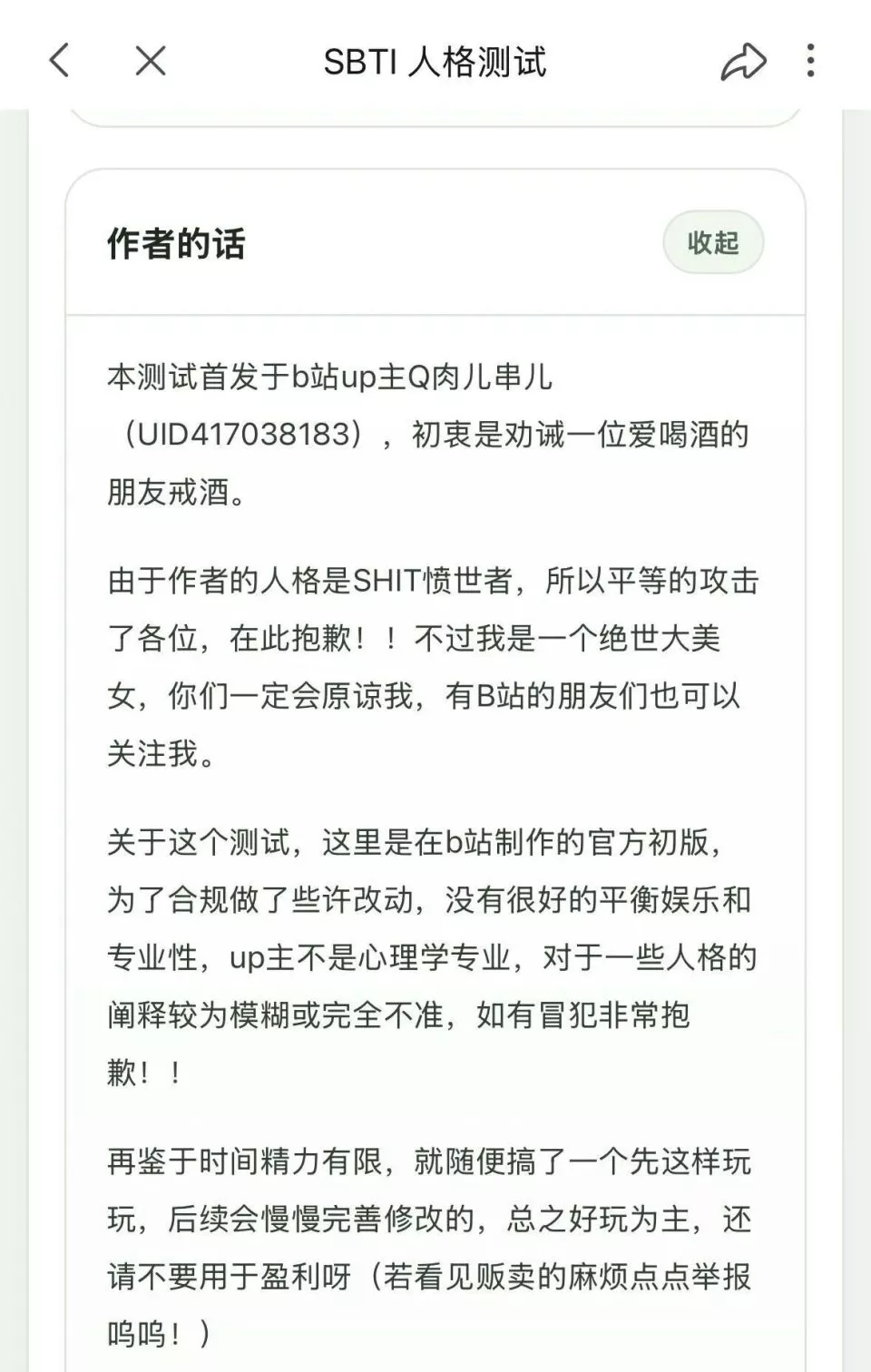 SBTI的火爆并不复杂:题目少、不用注册、完全免费。更重要的是,它没有任何说教意味。作者在测试结尾特意注明:“我不是心理学专业,部分人格的阐释可能模糊或不准确,仅供娱乐,切勿用于商业用途。”