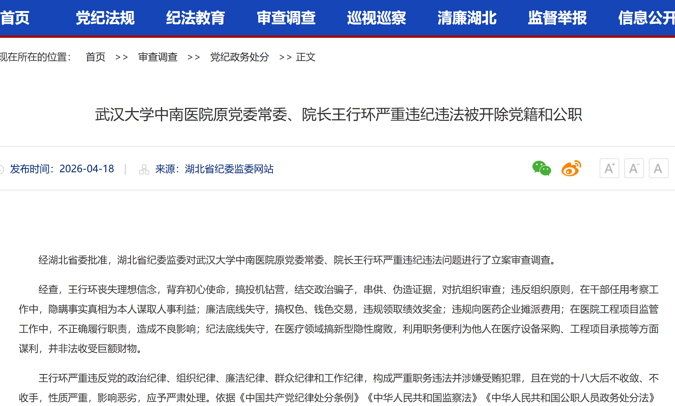 经湖北省委批准,湖北省纪委监委对武汉大学中南医院原党委常委、院长王行环严重违纪违法问题进行了立案审查调查。
