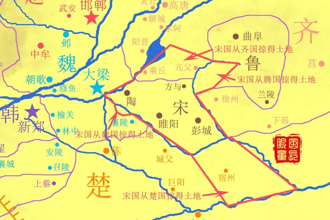 在宋康王奋力经营下,宋国有兵车五千乘,带甲数十万。领土增长大致是四个部分:灭掉了腾国;从魏国攻取两座城;从齐国攻取五座城;从楚国夺取三百多里地。宋国疆域达到全盛,仅比魏韩两国略小,可谓战国第八雄。