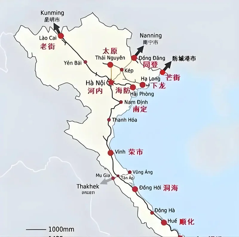 目前,中越之间规划了三条跨境标准轨铁路,全部采用与中国接轨的1435毫米标准轨距,彻底打破历史上“米轨”与标准轨互不兼容的困局: