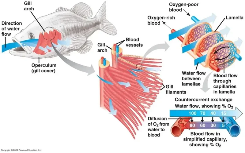 鱼依靠鳃呼吸,鳃丝上密布毛细血管,水从口腔进入,流经鳃,再从鳃盖排出。鱼鳃内部血液流动的方向与水流的方向完全相反,这种机制叫逆流交换[2](下图)。