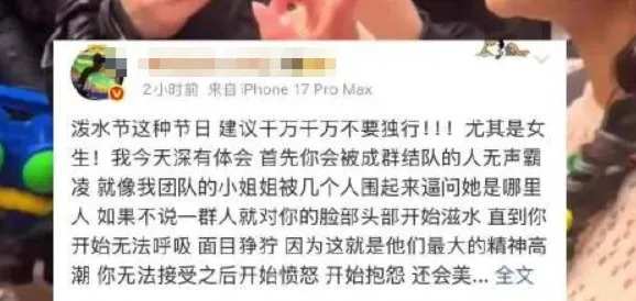 更让人感到可怕的是,一位网红发文说:“泼水节这种节日,建议千万千万不要独行,尤其是女生!我今天深有体会,最主要里面现在不是水,是酒,是卸妆水,是未知液体,我被泼完之后脸上火辣辣的,干了之后身上一股酒味儿。”