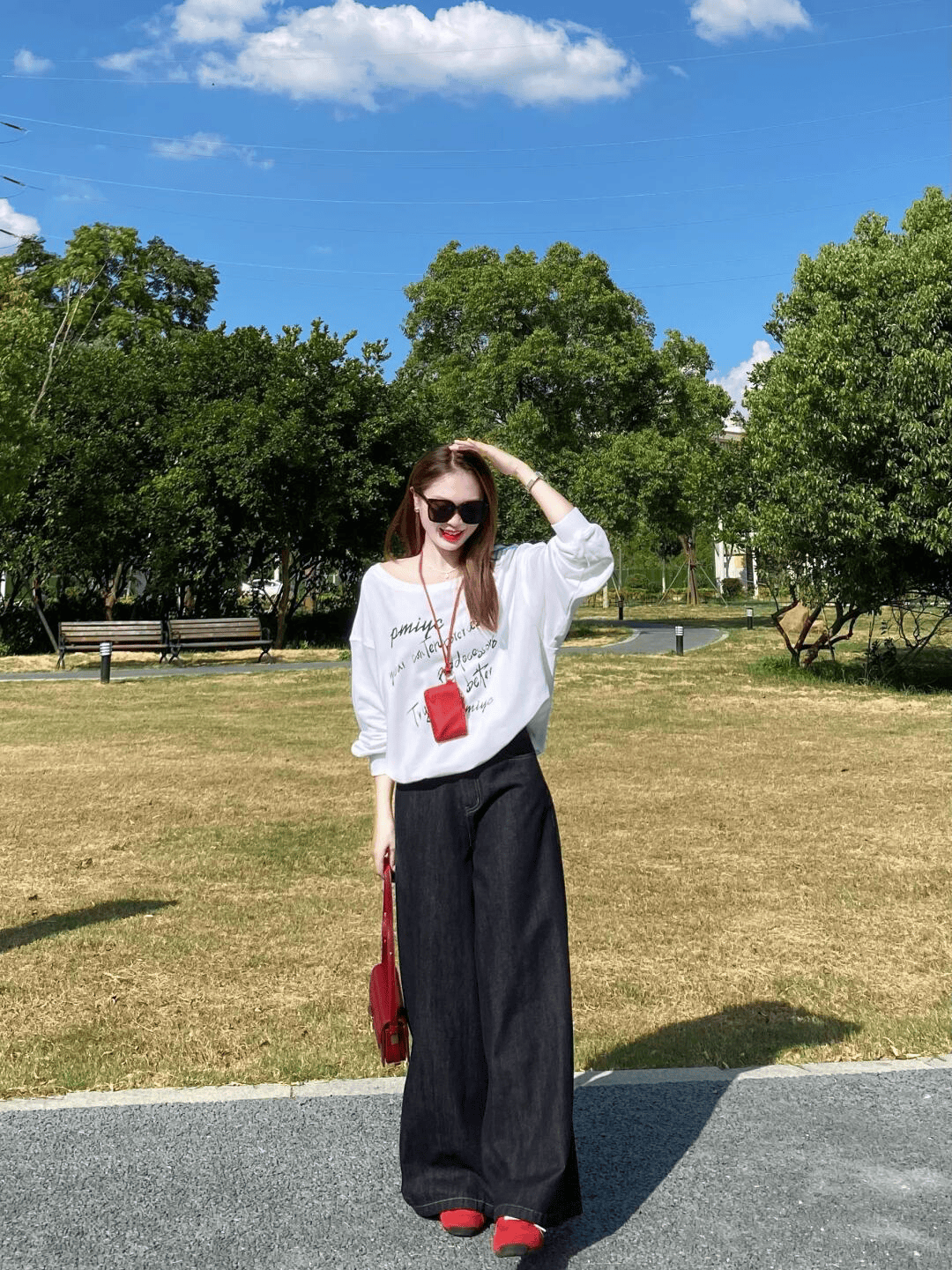 白色卫衣+黑色阔腿裤,减龄又随性,舒舒服服!红包红鞋点缀吸睛,休闲又不时髦感。
