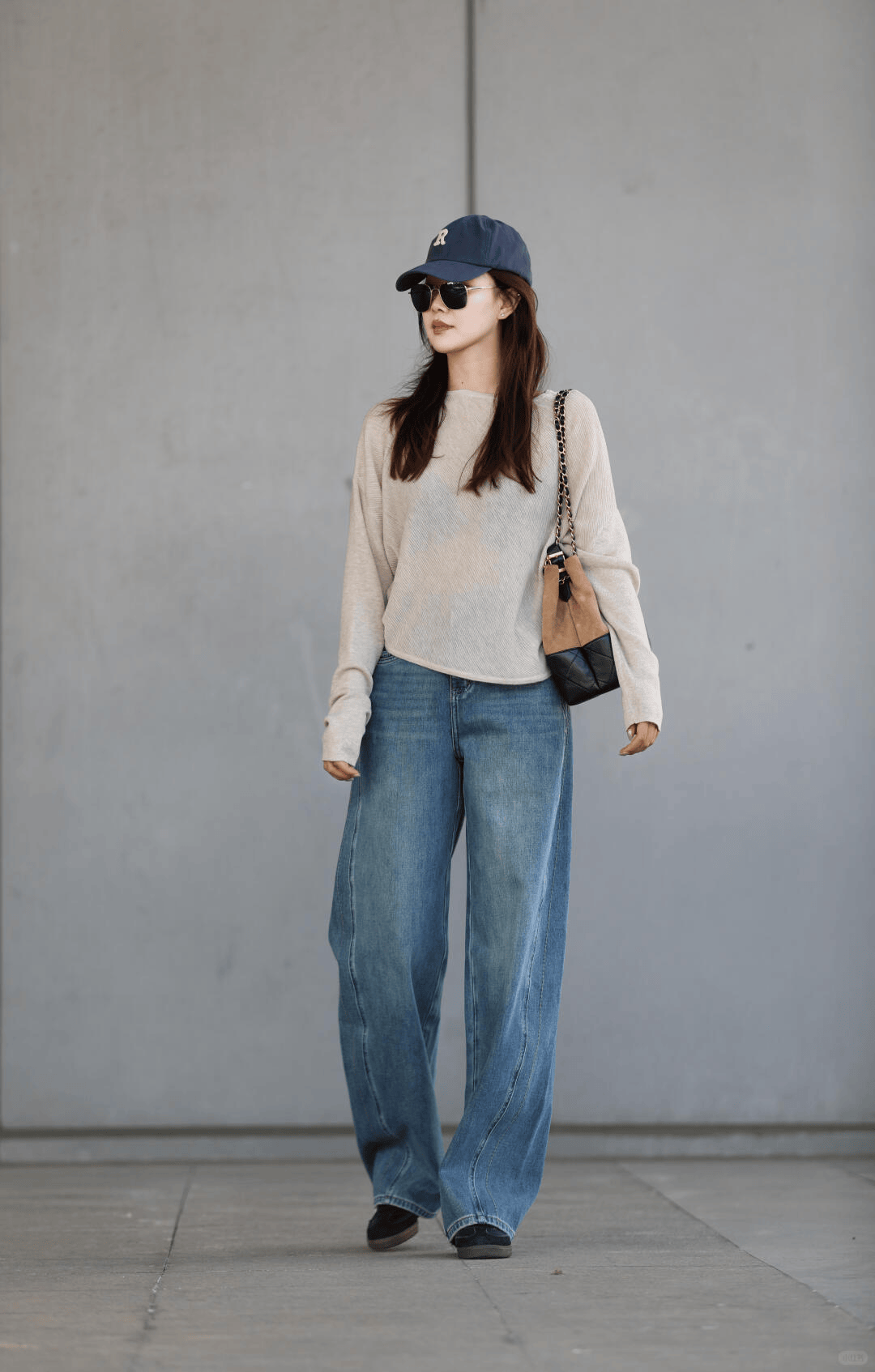 宽松针织衫 + 牛仔阔腿裤