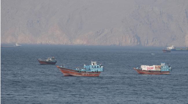 波斯湾咽喉要道荷莫兹海峡17日至18日短暂重启,靠近海峡南半部阿曼飞地穆桑达姆半岛(Musandam Peninsula)的海域出现船只与油轮航行身影。(路透)