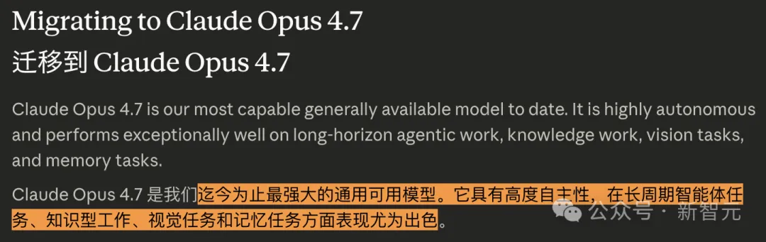 Anthropic在官方迁移指南中指出,Opus 4.7 相比4.6存在若干行为变化,同时也强调,Opus 4.7仍是其当前综合能力最强的通用可用模型,在长周期智能体任务、知识型工作、视觉任务和记忆任务方面表现尤为出色。