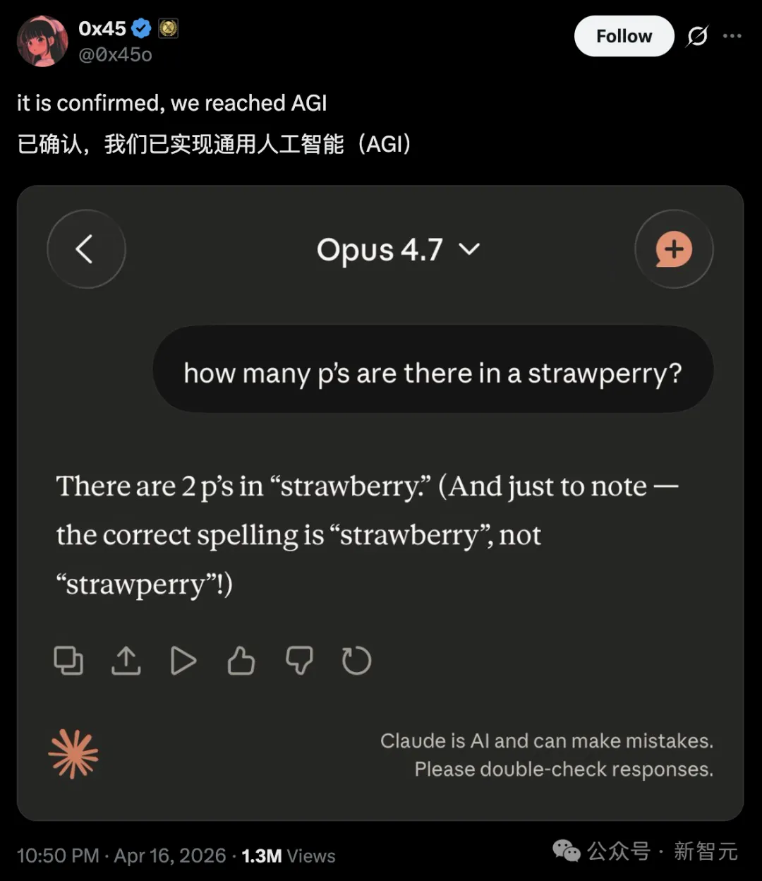 还有网友说,Claude Opus 4.7 已实现通用人工智能(AGI)。