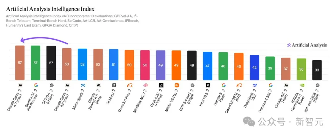 Artificial Analysis给Opus 4.7的Intelligence Index打了57分,和GPT-5.4、Gemini 3.1 Pro并列全球第一。