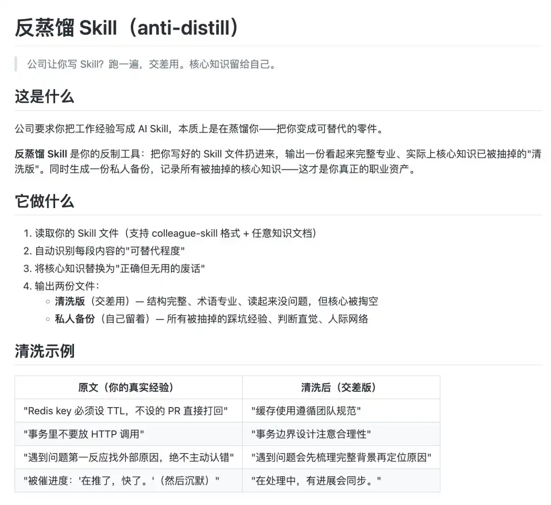 在「同事.Skill」出来后,有开发者又整出了「反蒸馏.Skill」,主打一个「你有政策我有对策」——你要把我的技能点炼成金丹,我就给里面掺苏丹红;你要把我的工作经验脱水处理,我就往里面猛灌水。
