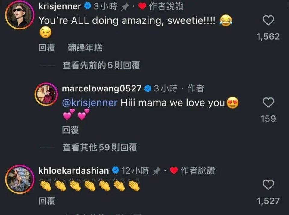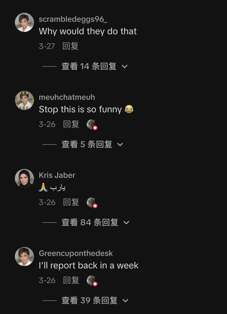 一位名叫@Marcelowang的TikTok博主将这次事件搬运到了外网,被Kris本人点赞,并且回复了她在真人秀里的那句名言:You'reALL doing amazing sweetie! (孩子们做得好!)