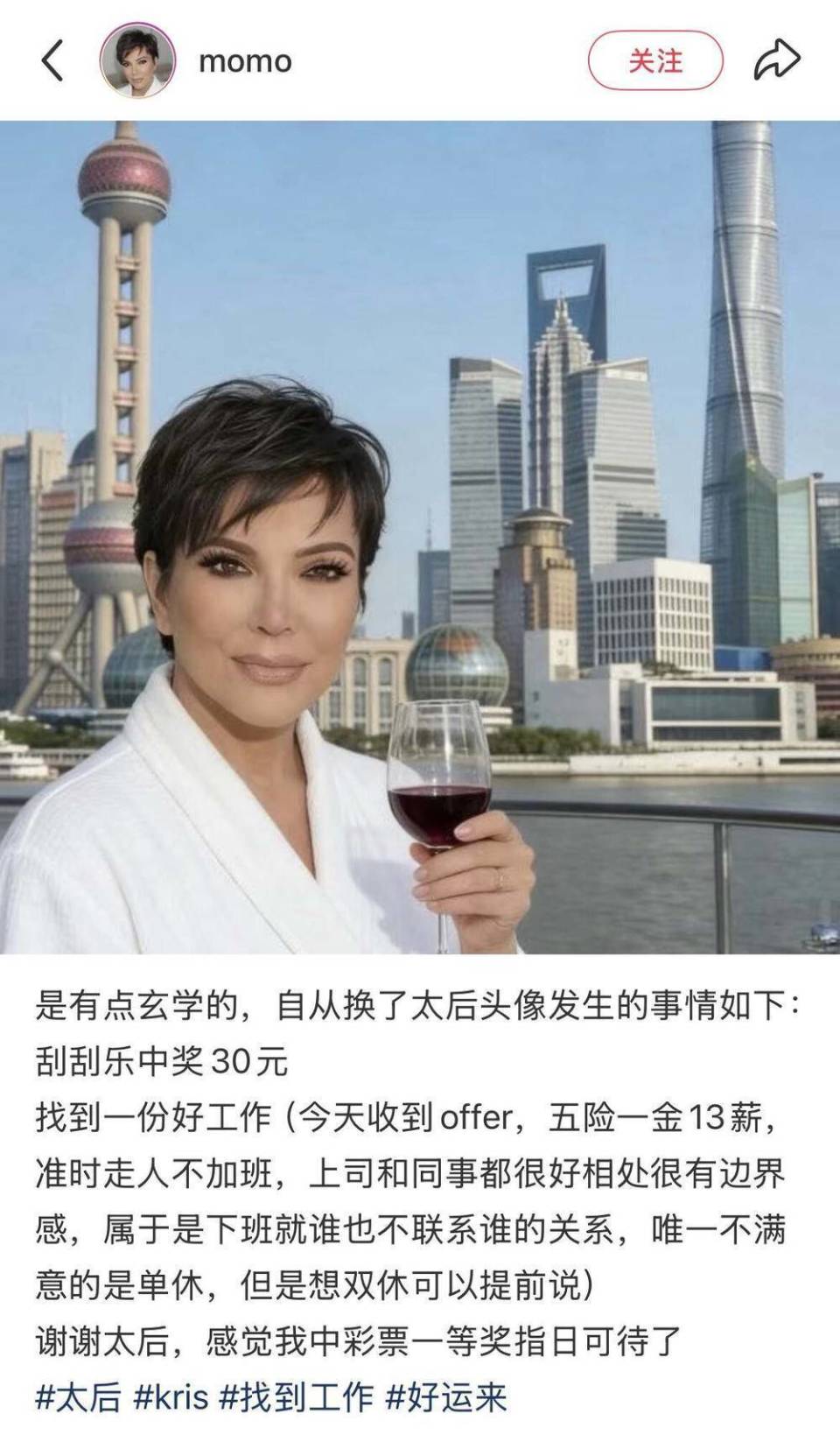 卡戴珊家族的大统领、七旬古稀老人、美国最有流量的女性之一的Kris Jenner,或许怎么都没想到,自己在晚年还能发一次来自大洋彼岸的财:中国年轻人集体换上了她的头像。