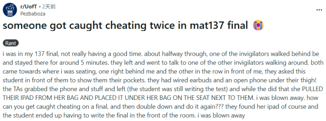但近日,Reddit上的一个帖子彻底炸开了锅——在MAT137的期末考场上,竟然有人在众目睽睽之下,表演了一场“极限操作”:被抓作弊后,转头又掏出了iPad试图再次作弊!