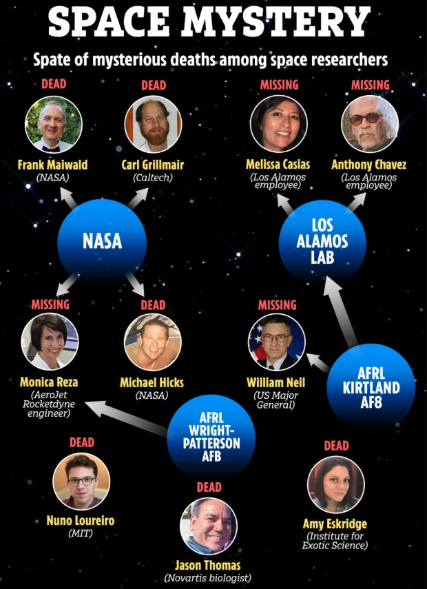 供职于喷气推进实验室的NASA科学家迈克尔·戴维·希克斯(Michael David Hicks,59岁)与弗兰克·迈瓦尔德(Frank Maiwald,61岁),则分别在2023年和2024年离奇身亡,至今死因不明。