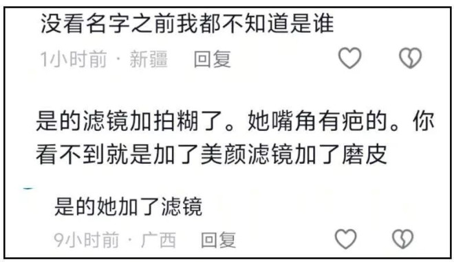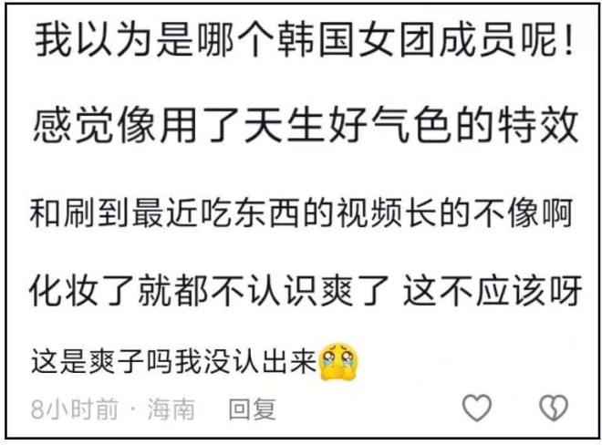 其实认不出来很正常,不知道是不是之前的吃播被吐槽太厉害了,郑爽似乎又开始容貌焦虑了,不仅不再更新素颜动态,新动态都还化了妆,美颜滤镜都加了好几层,特效和后期一整个拉满,脸都有点变形了,迎面而来的网红感都快挡不住了,还有一股子韩国女团爱豆的味。
