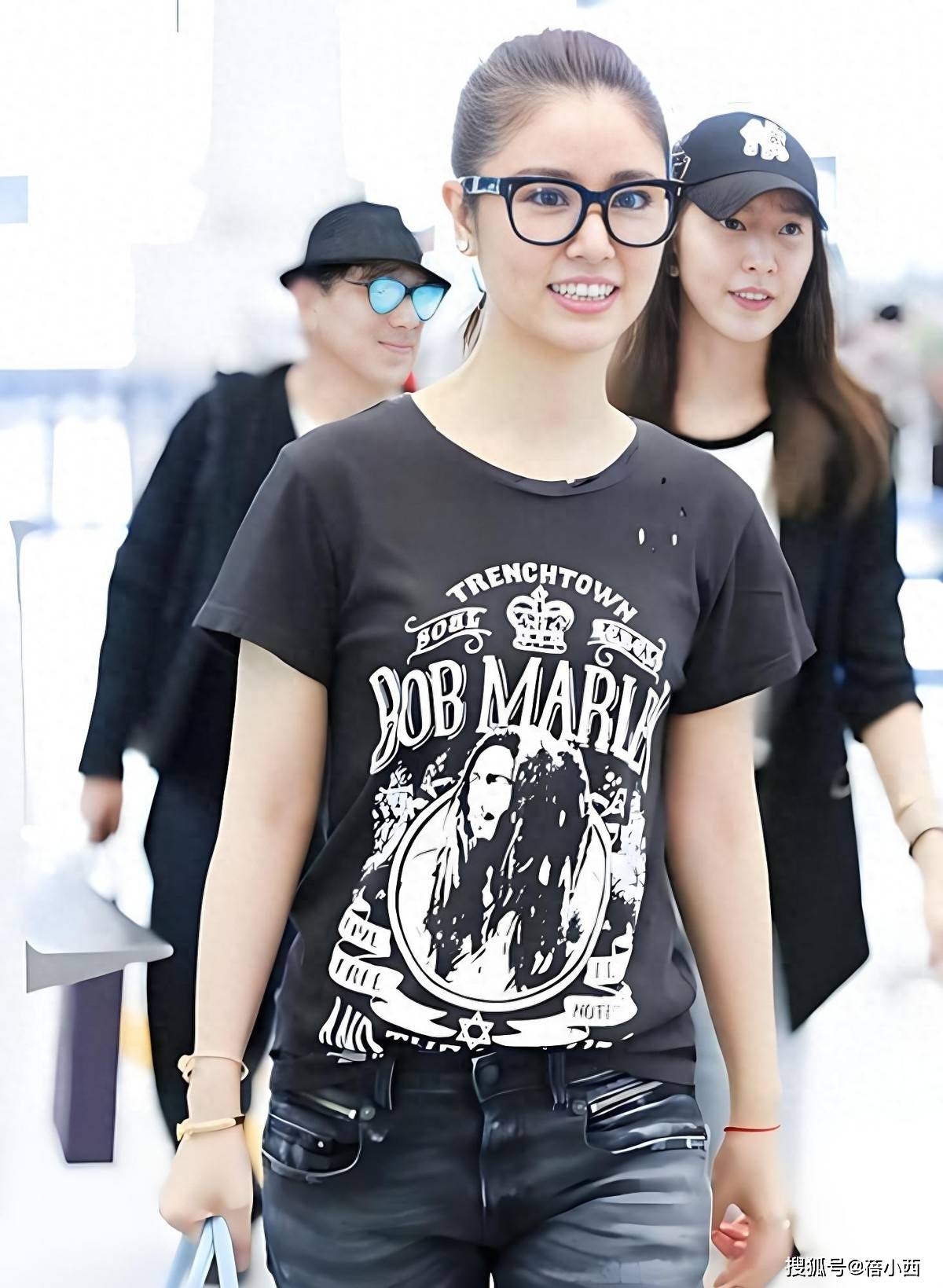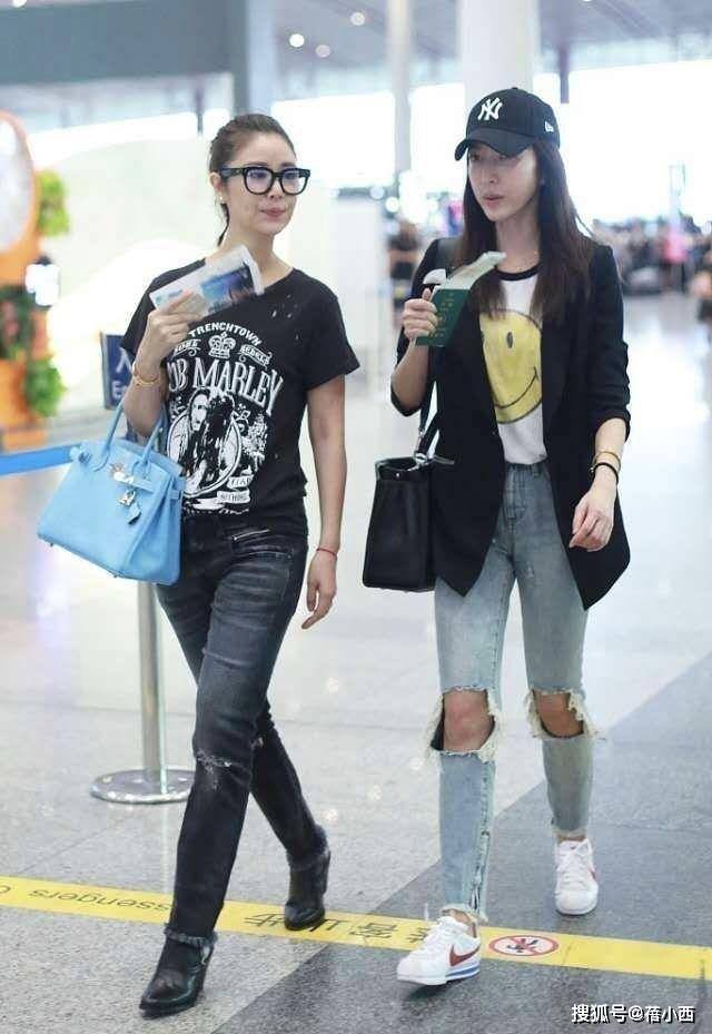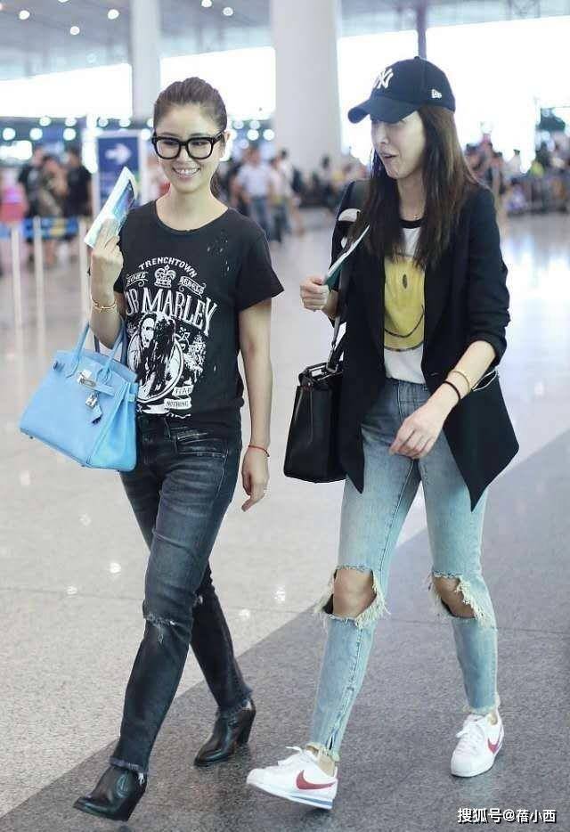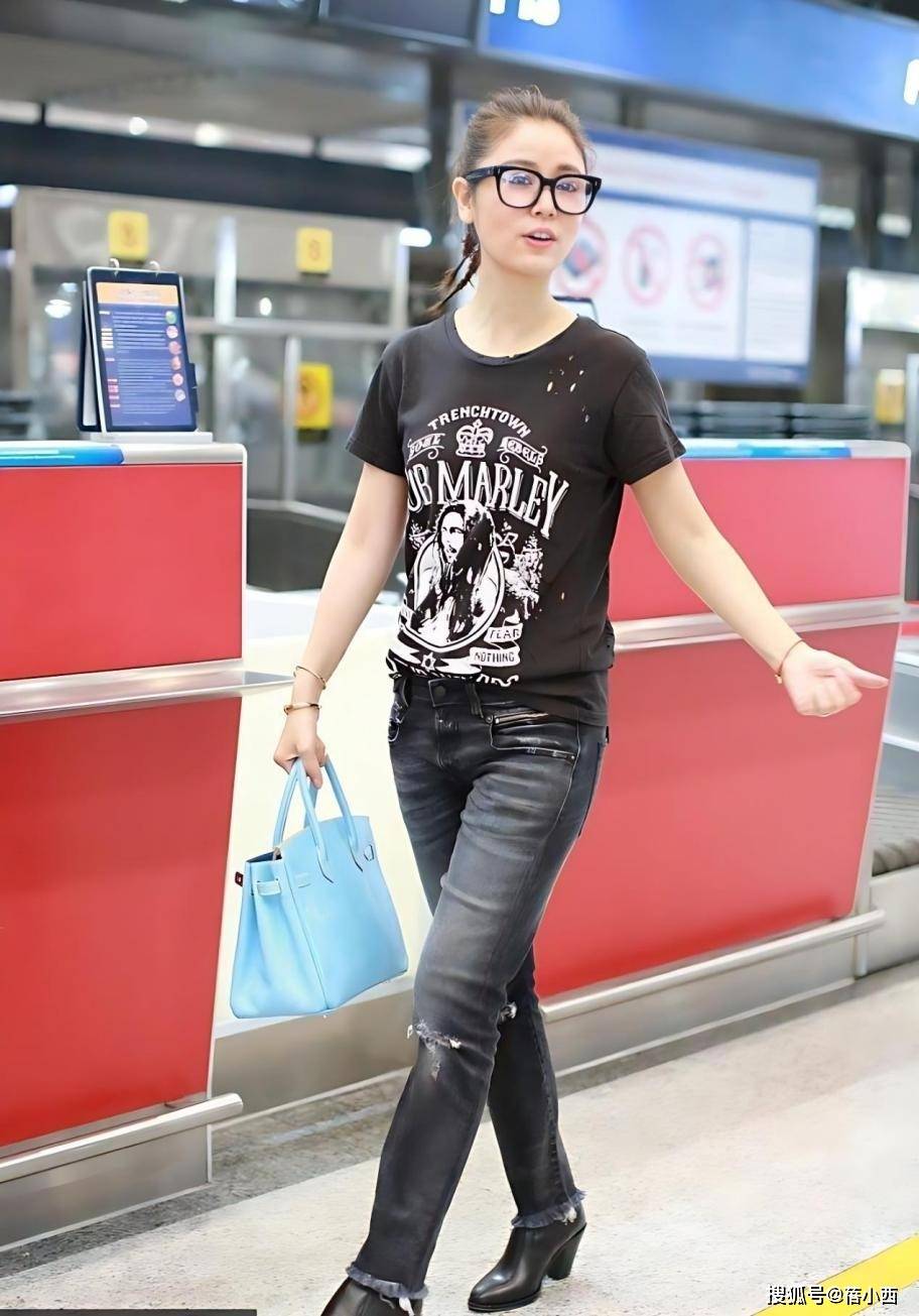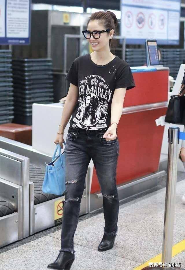 就拿她机场这套造型来说,一件简单的黑色印花T恤搭配做旧破洞牛仔裤,再配上浅蓝色的手提包和黑色短靴,整个人清爽又有活力,完全没有中年女人常见的油腻感。这件黑色T恤带着复古印花图案,自带几分随性的街头感,宽松的版型不挑身材,也不会显得刻意紧绷。