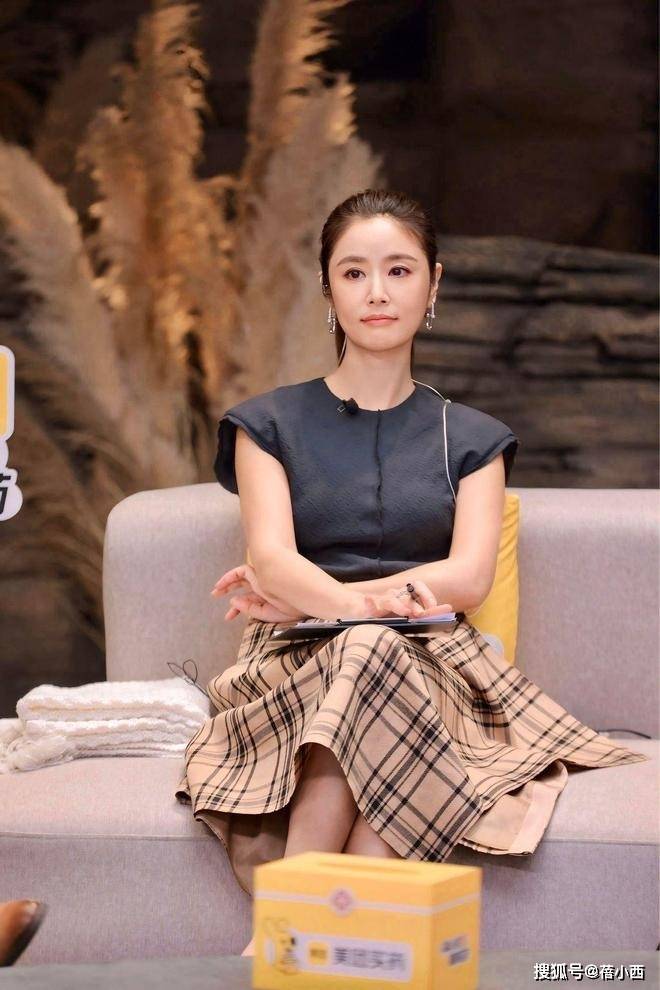 再看她另一套节目里的造型,一件黑色无袖上衣搭配卡其色格纹半身裙,整个人温柔又大气,完全是大家闺秀的既视感。这件黑色无袖上衣版型利落,肩部的小设计显得肩线很直,整个人看着挺拔又有精神,搭配的卡其色格纹半身裙自带经典的英伦风,A字的版型对身材的包容度超高,能修饰胯部线条,又自带优雅气质。