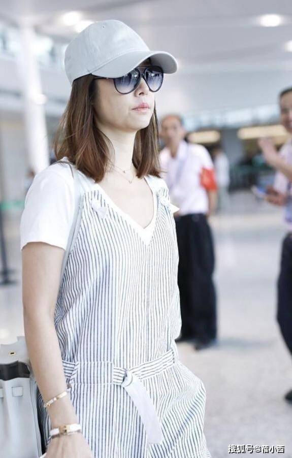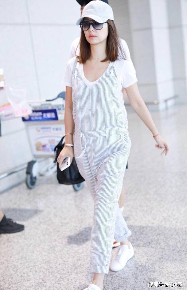 还有她之前的一套机场造型,白色T恤搭配条纹背带裤,看着就像二十多岁的少女,减龄效果直接拉满。纯白色的基础款T恤干净清爽,搭配蓝白条纹的背带裤,自带几分学院风的俏皮感,宽松的背带裤版型对身材非常友好,腰间的抽绳设计还能轻松打造出腰线,避免了臃肿感。