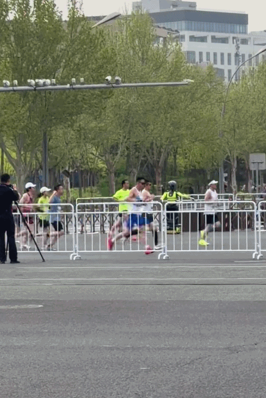 4月19日7时30分,北京亦庄半程马拉松比赛鸣枪开跑,在距离出发点不远的第二个转弯处,一台涂装着交警荧光绿式样的机器人正站在圈定的区域内,不断用左转手势指挥参赛选手左转,并进行语音提示。