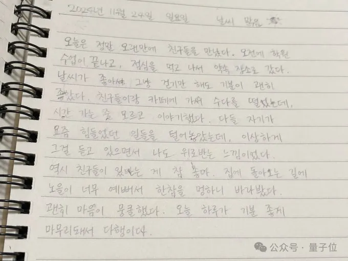 让GPT帮我翻译了下,确实不是乱码,大概是一份韩国高中生日记,内容是周日早上和朋友们上完补习班后,下午去喝了咖啡,觉得有朋友真好,巴拉巴拉……