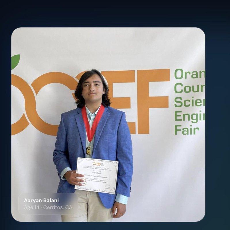 南加州橙县科学与工程博览会中,14岁学生巴拉尼(Aaryan Balani)展示其研发成果并获颁奖项。(取自主办方官网)