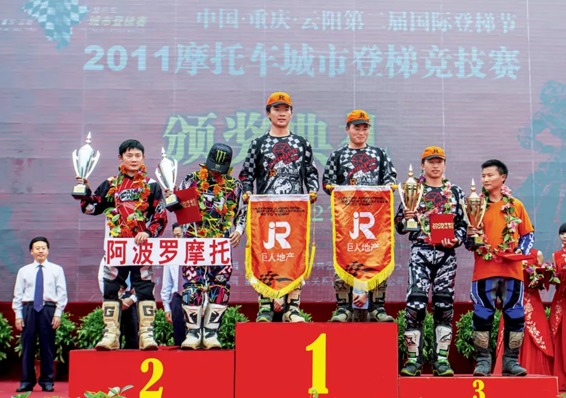 ·2011年9月27日,张雪(前排左一)参加重庆云阳摩托车城市登梯竞技赛,并代表阿波罗摩托获得第二名。(视觉中国)