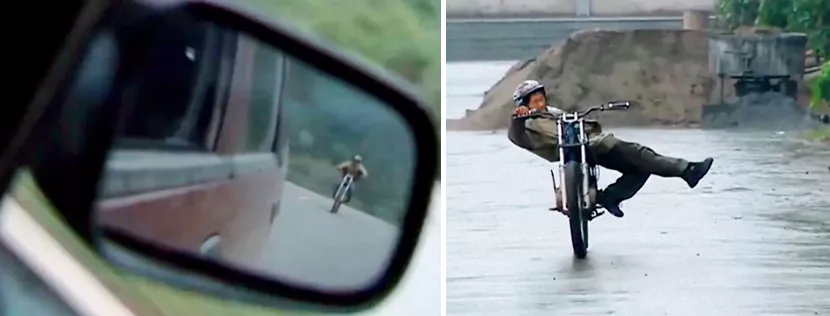 ·2006年,张雪骑摩托车追逐电视台车辆,并在节目组前秀车技。(视频截图)