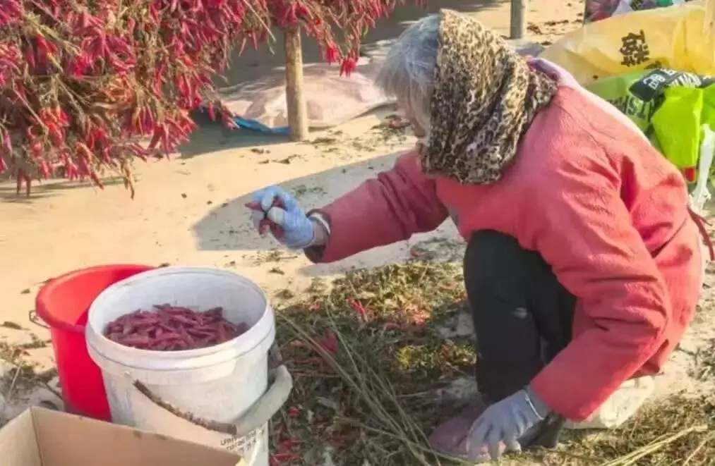 图为摘辣椒的老年农民,摘一天大概有三四十块